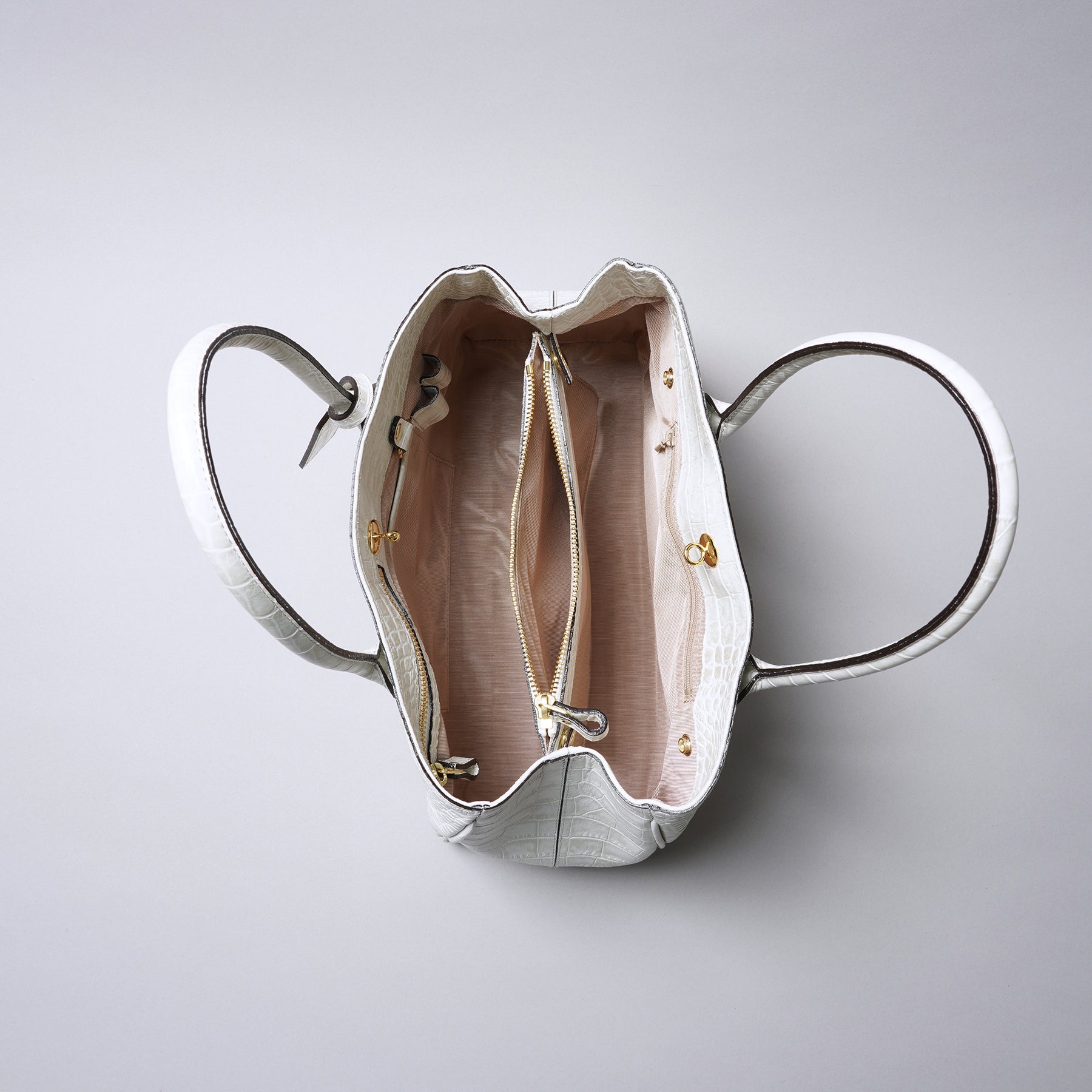 Chroma系列商品使用高雅的鱷魚壓紋牛皮製作而成,可廣泛使用於商務場合至日常生活等各種場景。包包中央的隔層口袋為可拆卸式,採用按扣設計,也可將之設置在包包後側。內部還配置卡片夾層、筆插等多種實用口袋,追求打造出如媽媽包般的收納便利性與實用機能。