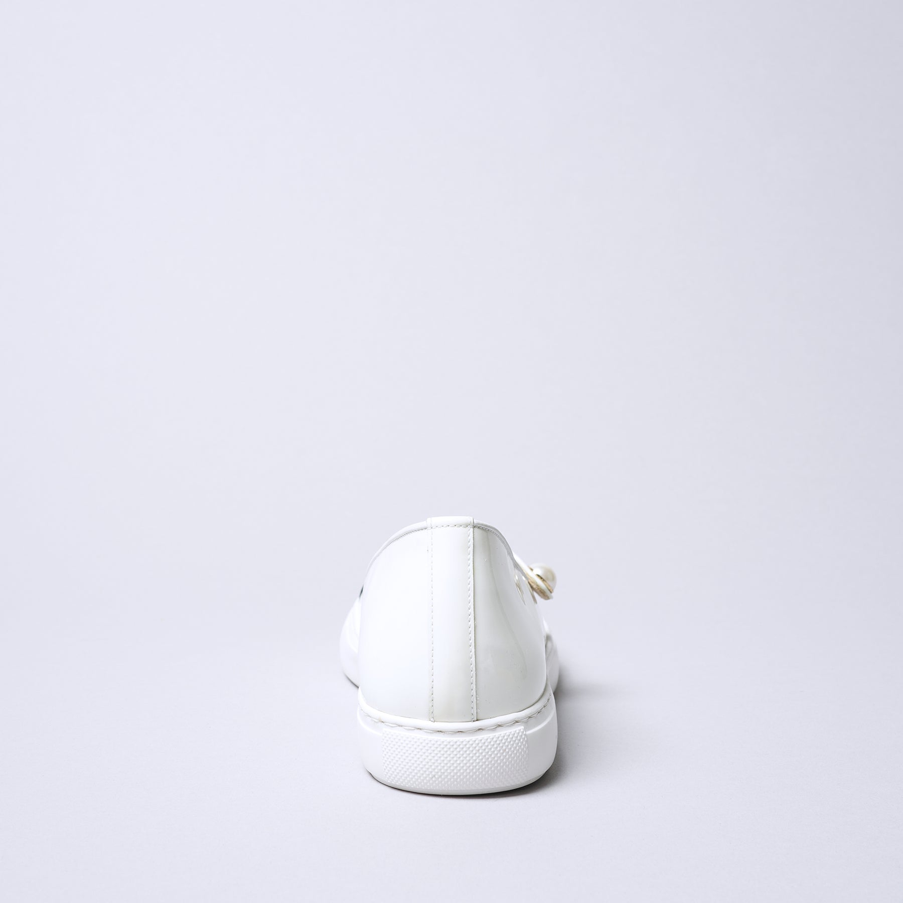 這款單扣帶球鞋於鞋頭設計一字型裝飾,並在扣帶上以珍珠點綴,散發出優雅感。扣帶部分因採用鬆緊帶材質,不易鬆脫,可完好貼合腳型。