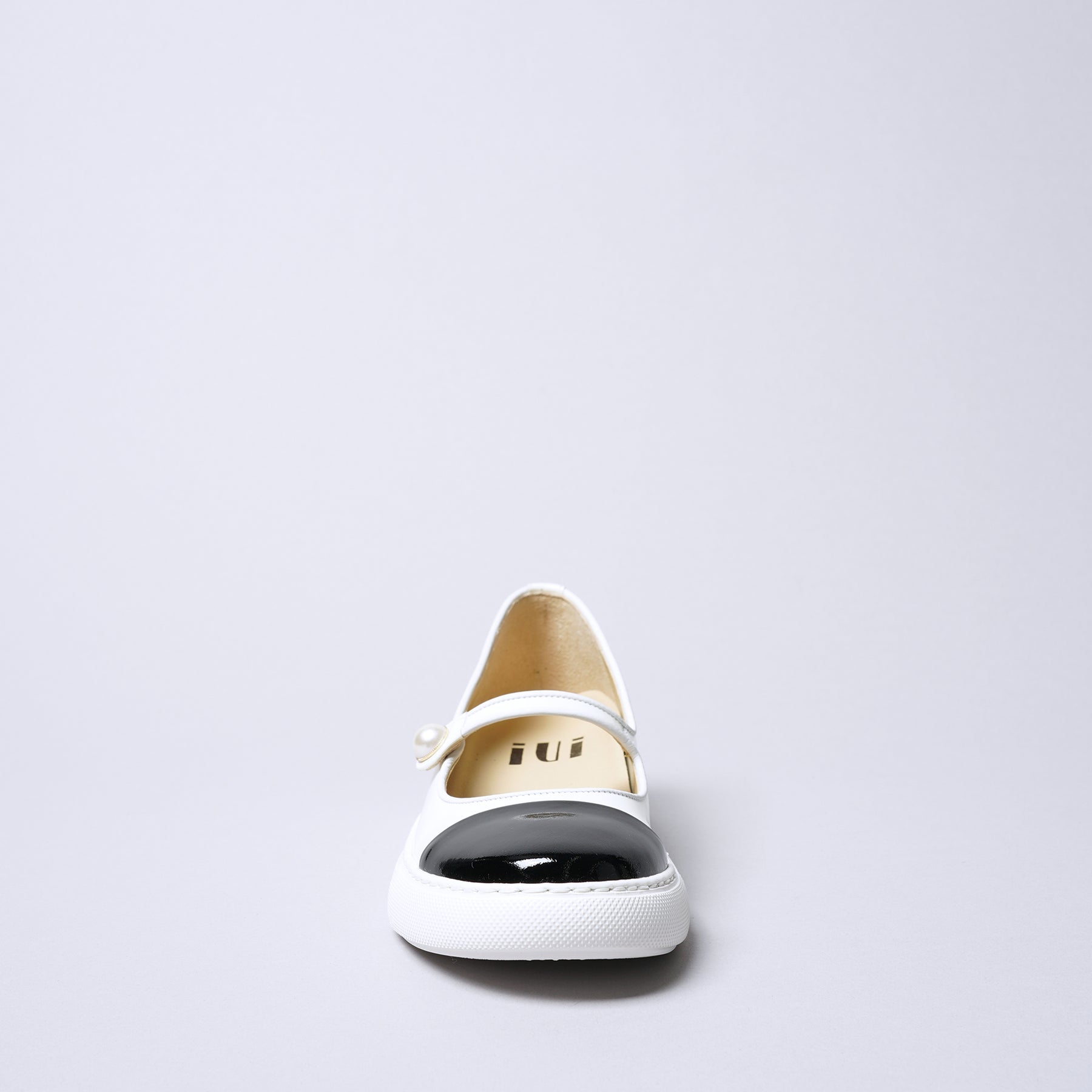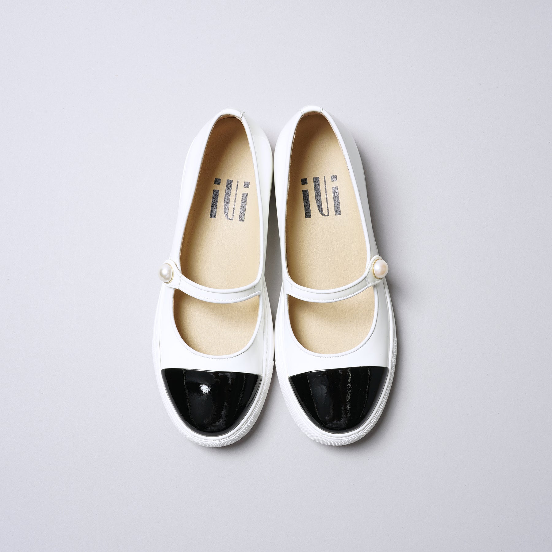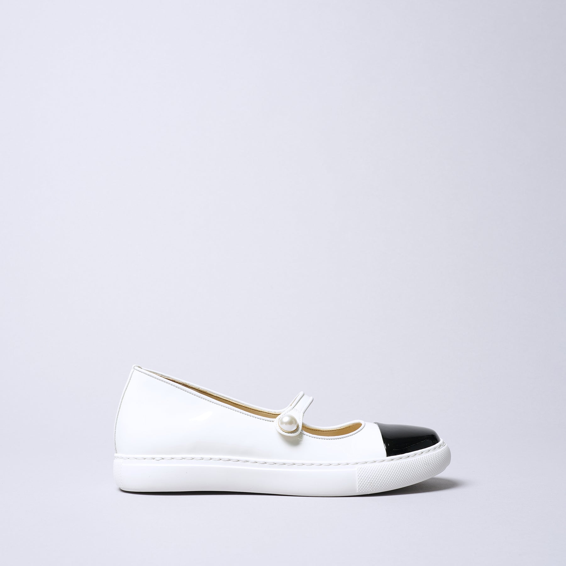 這款單扣帶球鞋於鞋頭設計一字型裝飾,並在扣帶上以珍珠點綴,散發出優雅感。扣帶部分因採用鬆緊帶材質,不易鬆脫,可完好貼合腳型。