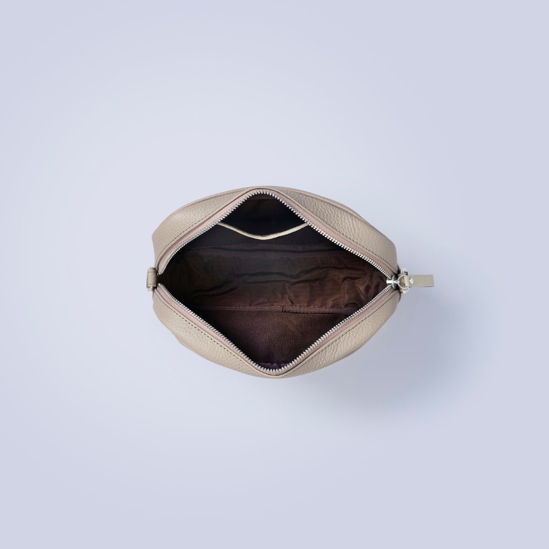 三面皆可打開的拉鍊設計,使內部一目了然,物品取放方便。內裏使用觸感柔滑的棕色緞面布料,內附便利內袋(約 20×12公分)。