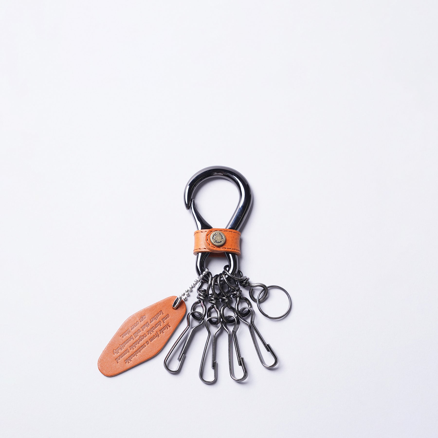 イタリア製牛革付属のキーホルダーシリーズ。鮮やかなカラーリングのイタリアンレザーを職人が丁寧に縫製し、ボリュームのある金具に合わせました。無機質な印象のキーホルダーも、イタリアンレザーを合わせることで華やかになり、おしゃれに鍵を持ち歩けます。シックな黒ニッケルのナスカンを使用したキーホルダーです。ボリュームのある金具ですが、フックでスムーズに着脱ができます。キーホルダーが4つ、キーリングが1つ、全部で5つの鍵を持ち歩くことができます。
