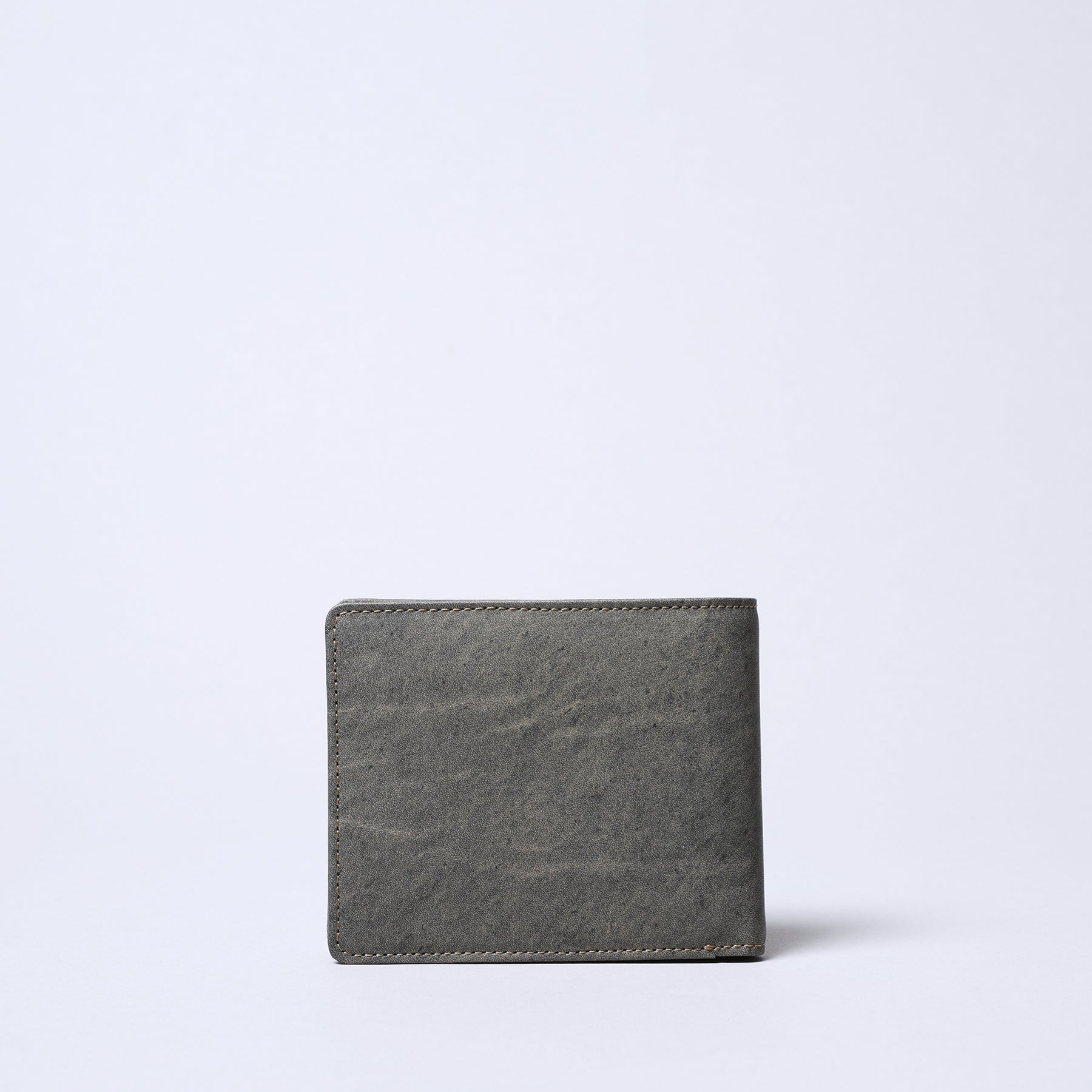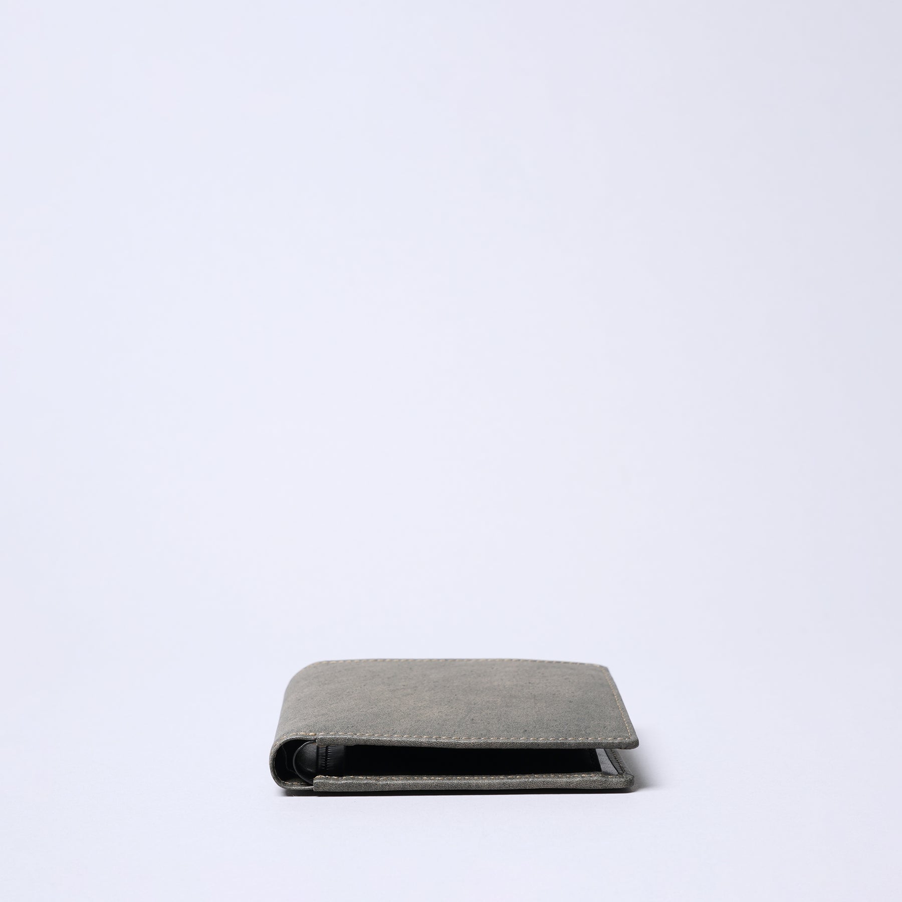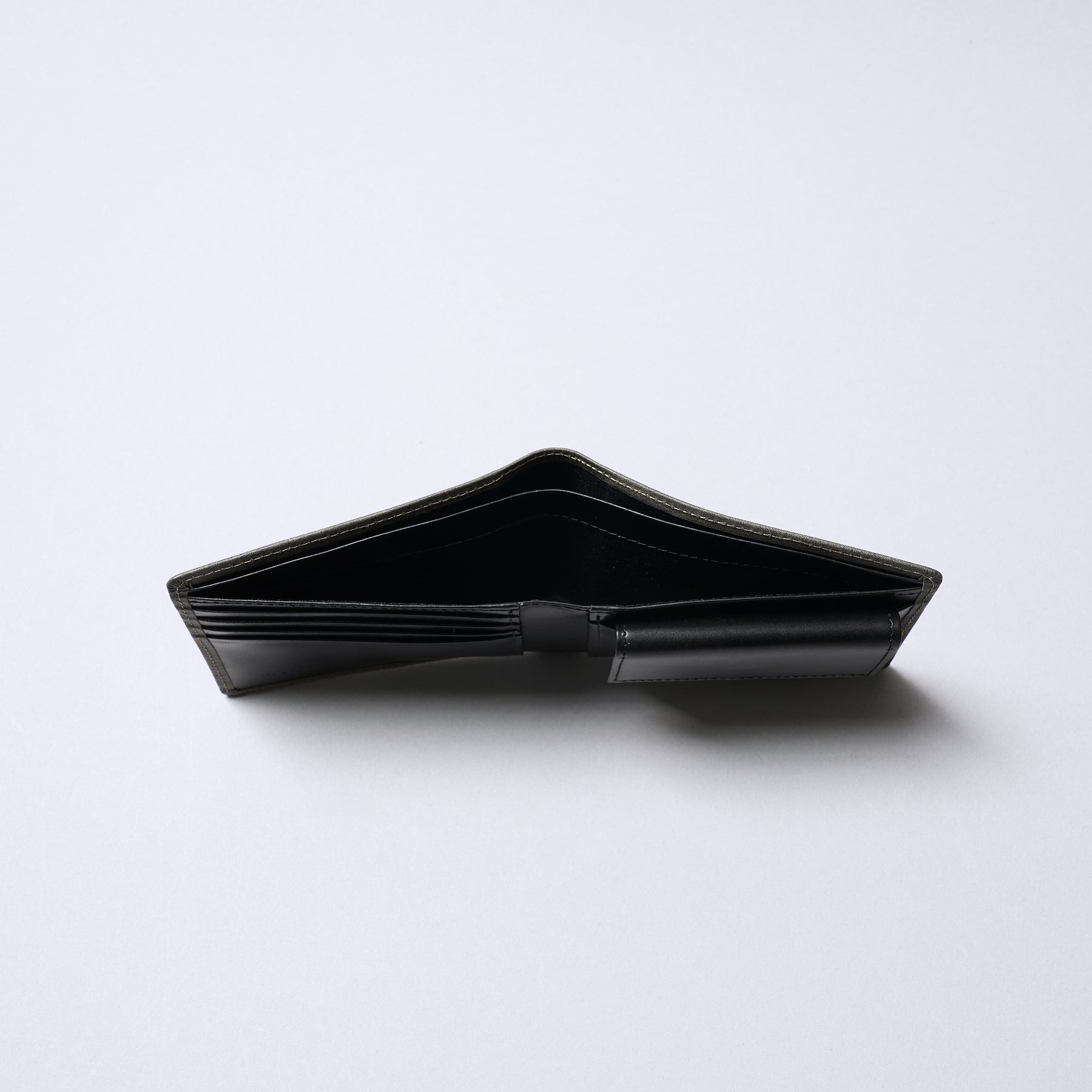 生後6ヶ月から2年程度の仔牛の革であるキップレザーを使用しています。きめ細かく、しっとりとした滑らかな肌触りが特徴で、成牛革に比べると薄手ながらも繊維が密で強度があります。使い込むほどに手に馴染み、美しいエイジング(経年変化)をお楽しみいただけます。その牛革に 日本古来の染色技法である墨染めを施しています。墨の持つ独特の深みのある黒色は、単調な黒色とは一線を画し、奥ゆかしい表情を生み出します。手作業による染色のため、一つひとつ異なる色合いや濃淡が現れ、唯一無二の個性となります。墨の自然な風合いが、革本来の素材感を引き立てます。 コンパクトで持ち運びやすい二つ折りタイプです。ジャケットやパンツのポケットにもスマートに収まります。使いやすさを追求した内装で 紙幣入れ、カードポケット、小銭入れなど、必要な機能をコンパクトにまとめました。日常使いに十分な収納力を備えつつ、無駄のない設計で使いやすさを追求しています。