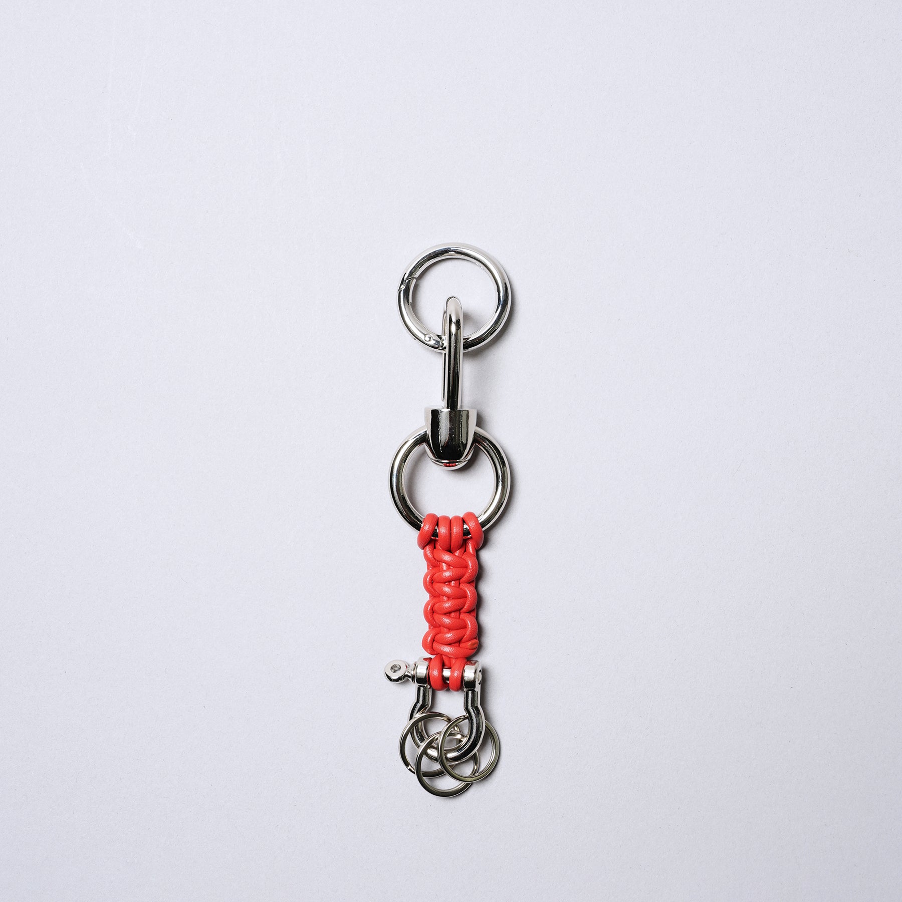 レザーコードの編み込みとフックカラビナ、ネジ式Dカンを組み合わせたキーホルダー