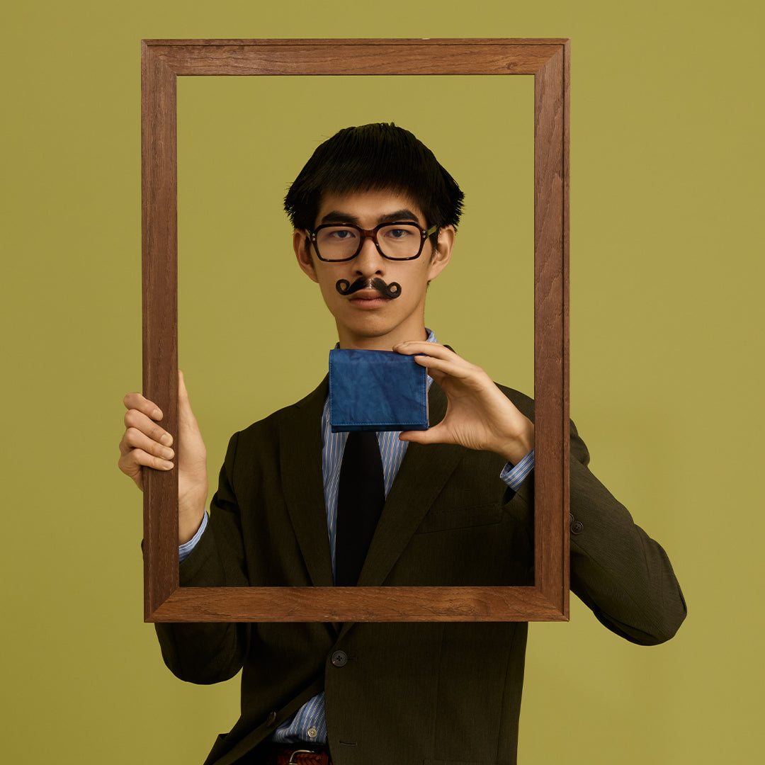 藍染とはタデ科の植物「藍(アイ)」を使った染物。柔らかいシープ革を使い、全て手作業で時間をかけ、手絞りと藍染の樽に漬ける作業を3度繰り返し、日本古来の上品な藍染『ジャパンブルー』が出来ました。手絞りなので模様と色合いはひとつひとつ異なります。お札はもちろんカードもたくさん入れたいし小銭も入れたいという方向けの折財布です。