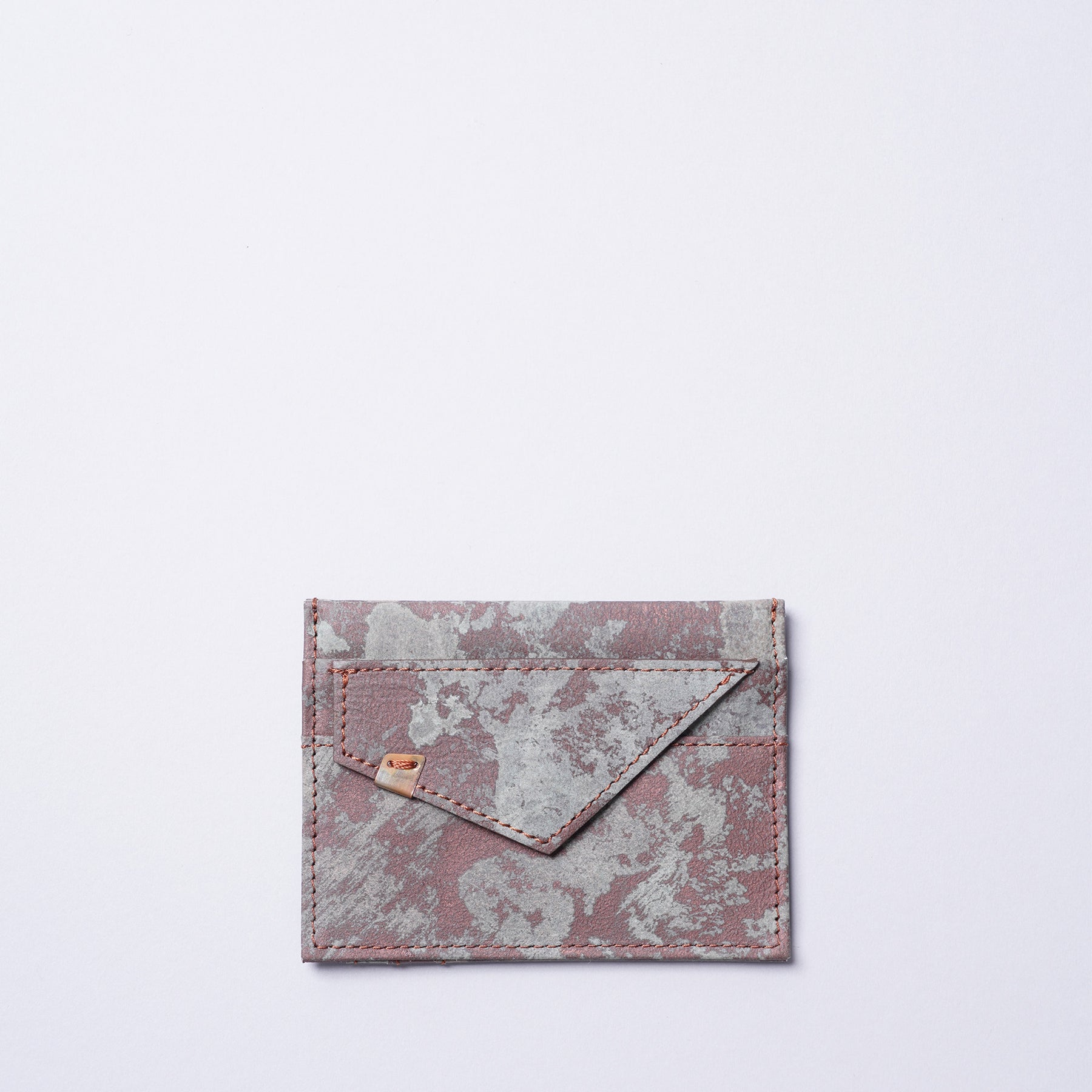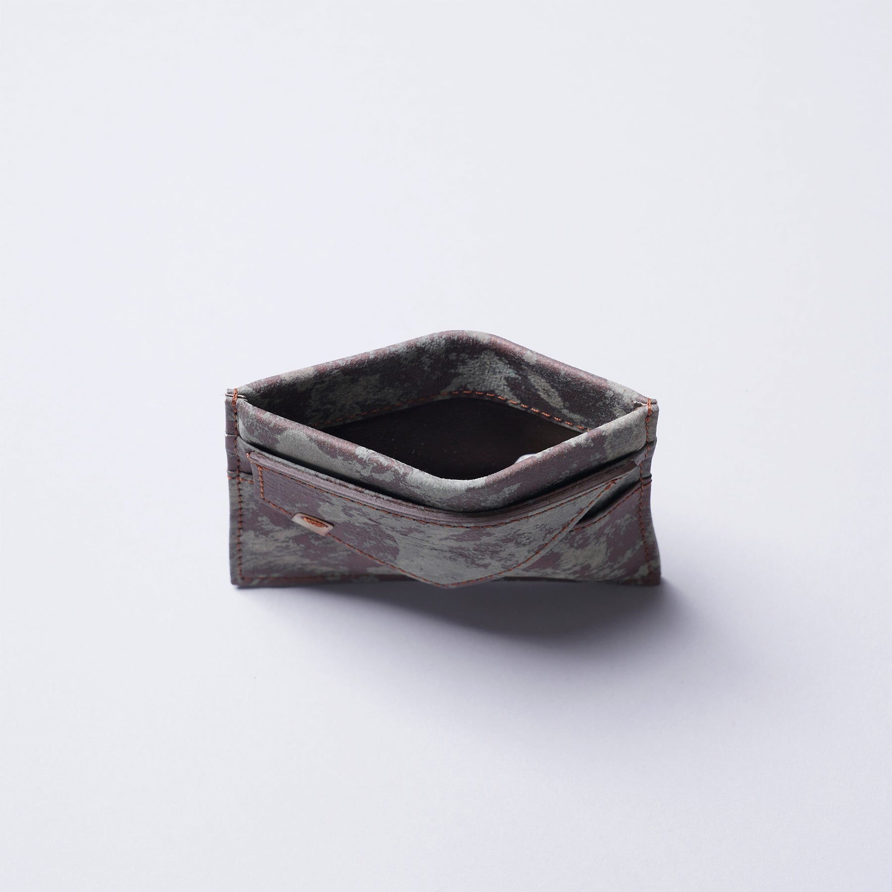 コンパクト設計のフラグメントケースです。真鍮、赤銅などを吹き付け、錆を呼び起こした本革を使用し、一枚、一枚革職人の経験と感性により生まれる、工芸品級の素材のフラグメントケース。キャッシュレス時代に合わせたデザインで小さな見た目に、カードや小銭、カギなどが収納可能。フラップには金属プレートが手縫いされ、keuの世界観を表すアクセントとなっています。