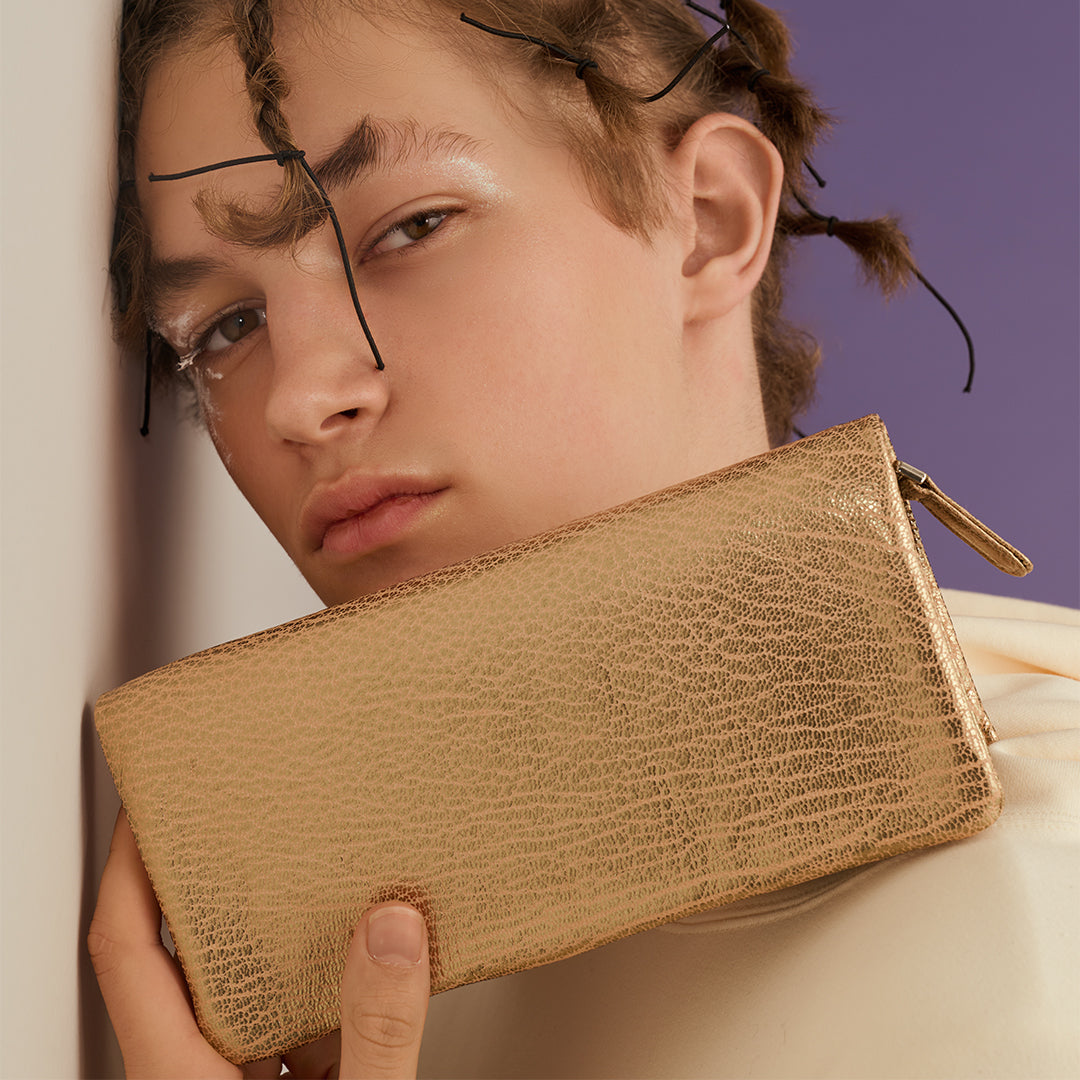 這款拉鍊長夾使用高級山羊皮製作而成,內部設有盒形零錢收納口袋,讓您握在手中閃耀光芒。為能最大發揮柔軟材質特性,採用內縫工藝,所有縫線皆隱藏在內,是一款極緻濃縮職人精湛技術的長夾。材質選用擁有獨特細緻紋理的山羊皮,觸感柔順,高級感十足。此款長夾的皮革表面富有自然紋理,與金屬光澤相映生輝,非常優雅美麗。