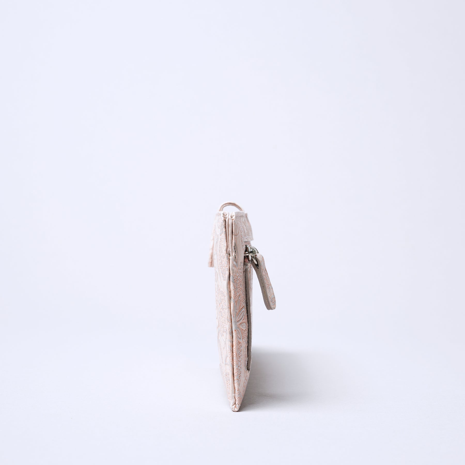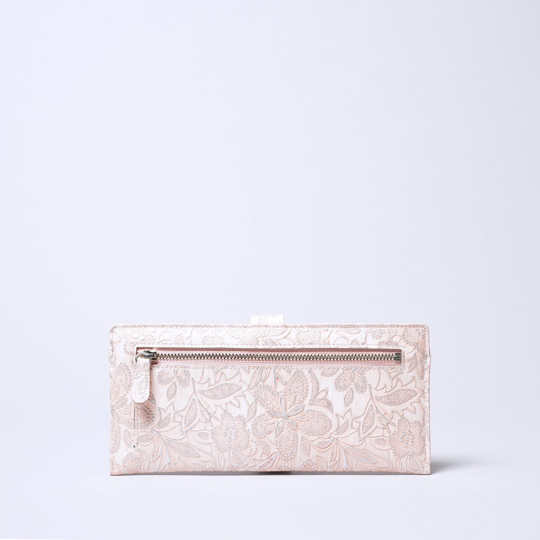 這款薄型錢包採用以細緻珍珠光澤加工的義大利製壓花皮革製作而成,散發出女性柔美華麗的氛圍。由日本職人精心製作,極薄款式卻仍能收納紙鈔、卡片與零錢。