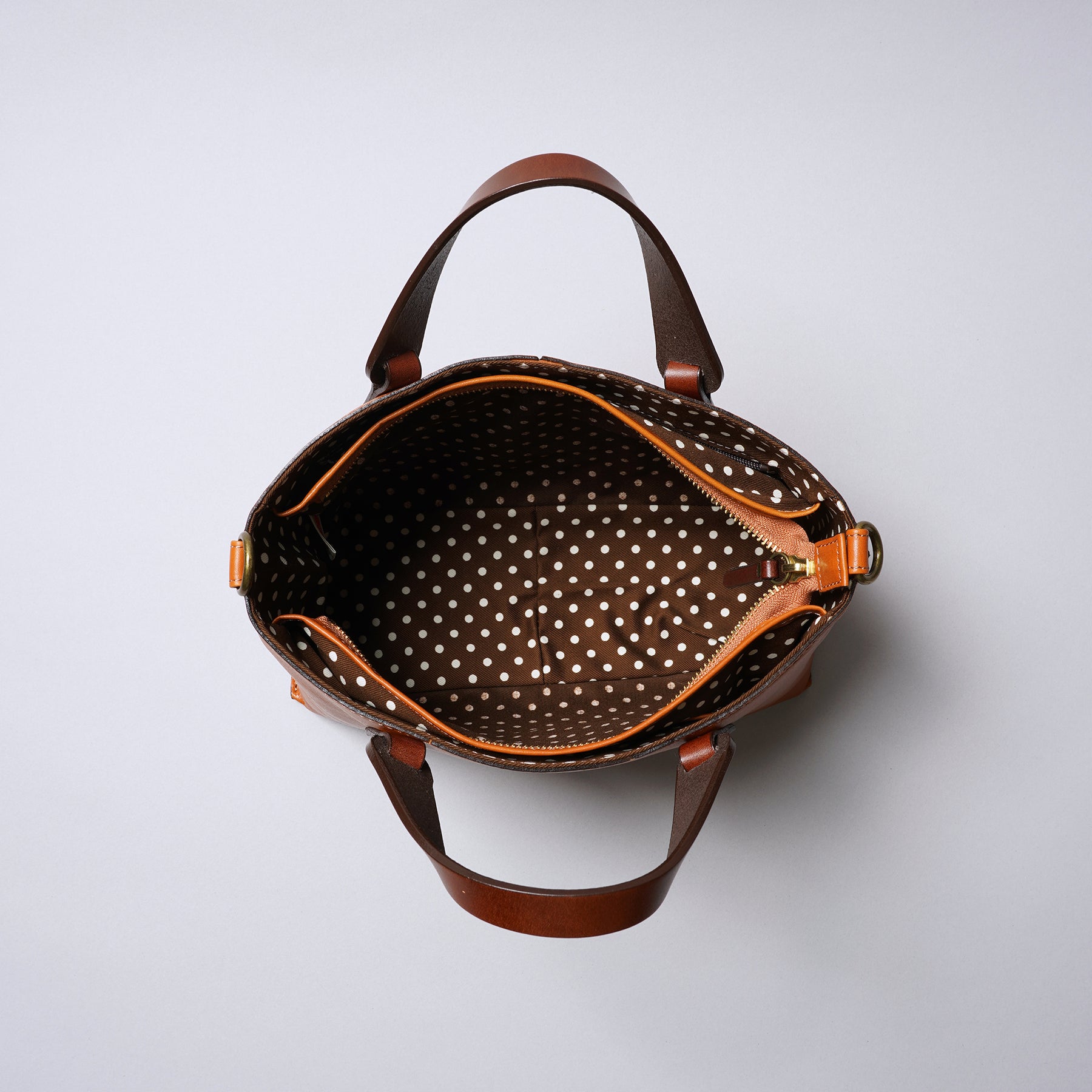 這款斜背包使用表面富有細緻紋理的牛皮製作,並以植鞣革配件裝飾,是品牌旗下長年熱銷的商品系列。從包包開口處可看見內裏採用圓點圖案材質,成為商品一大特色。以同材質製作的皮革肩揹帶依照使用需求可自由拆卸。還可享受皮革隨著使用時間經過產生的質感變化,越使用將越柔軟,呈現出豐富多彩的魅力。
